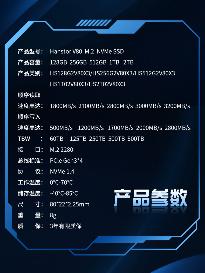 Hanstor 汉储V80 系列是深圳市捷通恒泰电子有限公司旗下面向消费类NVMe系列Gen3*4产品,支持容量128GB~2TB