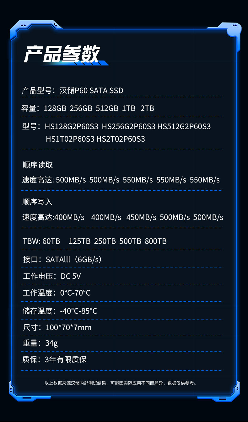 HANSTOR汉储P60系列固态硬盘是深圳市捷通恒泰电子有限公司旗下消费级SATA接品产品,支持容量128GB~2TB